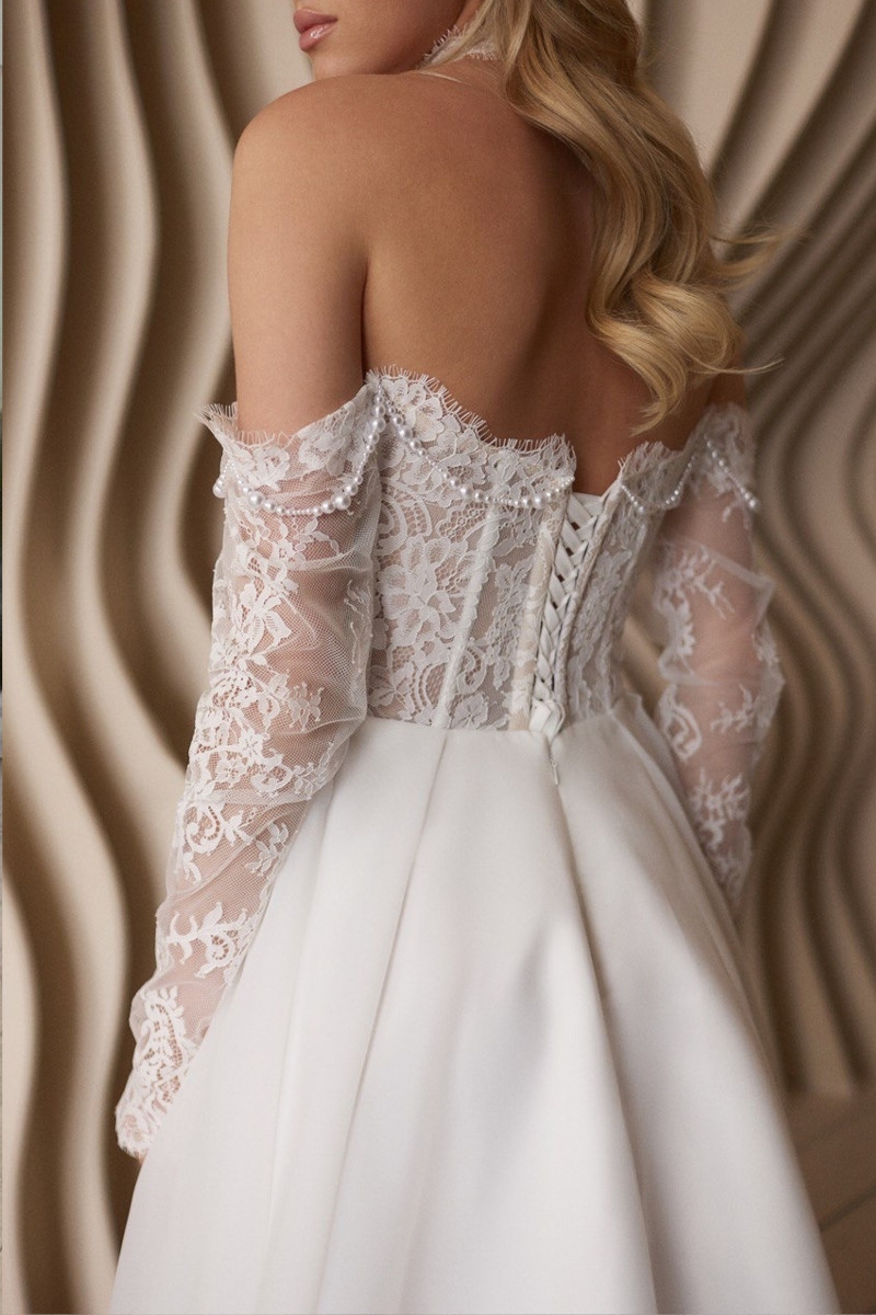 ✨ Это платье – воплощение воздушности и романтики. Изысканное французское кружево в сочетании с россыпью бусин создает эффект мерцания, а легкий шлейф придает образу торжественность и грацию, не утяжеляя силуэт.